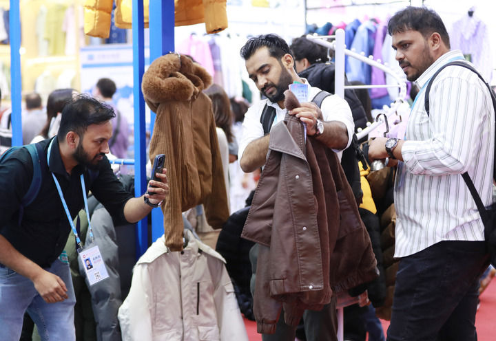 2025年5月1日,在广州开幕的第137届广交会第三期上,境外采购商在一家服装企业的展区拍摄样品。新华社记者 王瑞平摄